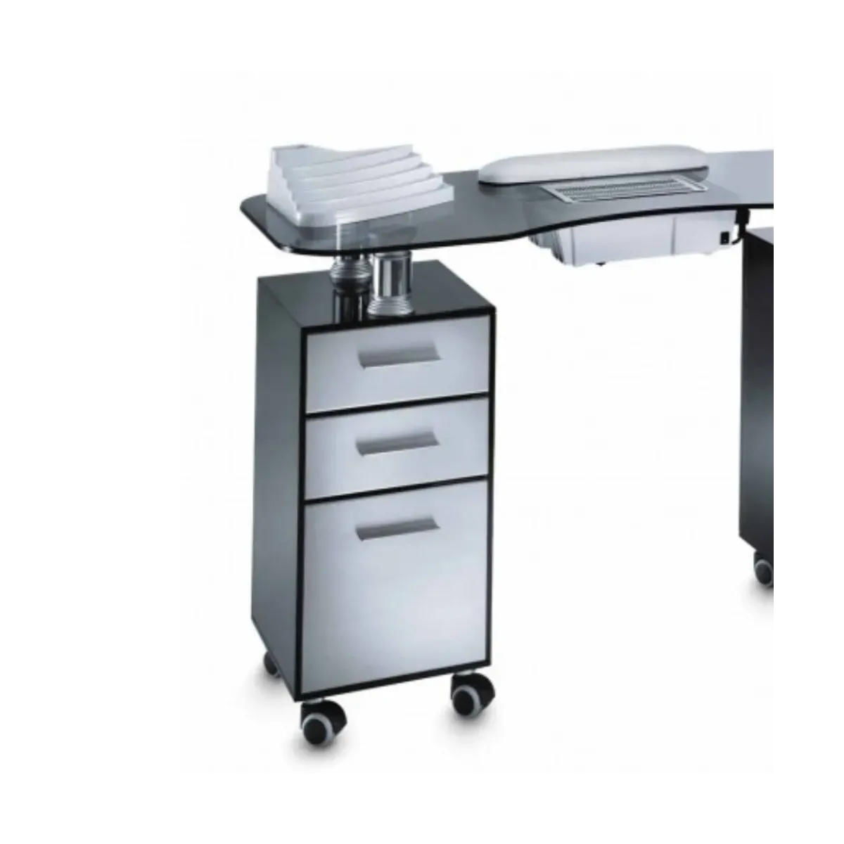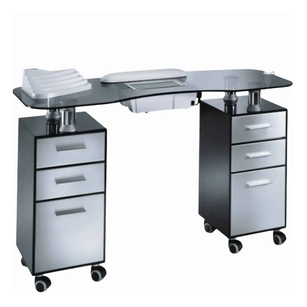 Tavolo Ricostruzione Unghie Professionale realizzato in vetro temperato dal colore fumé, una tecnica studiata dai nostri artigiani italiani per differenziarsi con eleganza e stile. E' dotato di 6 cassetti in legno con manici estraibili e ruote gommate auto frenanti utili per garantire stabilità durante il lavoro e funzionalità nel caso desideri spostarlo per eventuali pulizie.