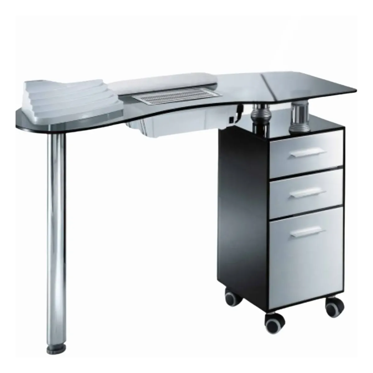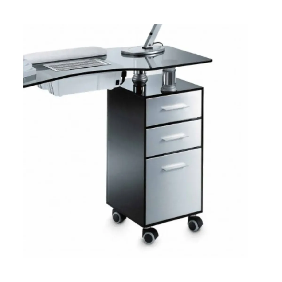 Tavolo per Manicure Professionale realizzato in vetro temperato dal colore fumé, una tecnica studiata dai nostri artigiani italiani per differenziarsi con eleganza e stile. E' dotato di 2 cassetti e 1 cassettone in legno con manici estraibili, inoltre ha delle ruote gommate auto frenanti utili per garantire stabilità durante il lavoro e funzionalità nel caso desideri spostarlo per eventuali pulizie.