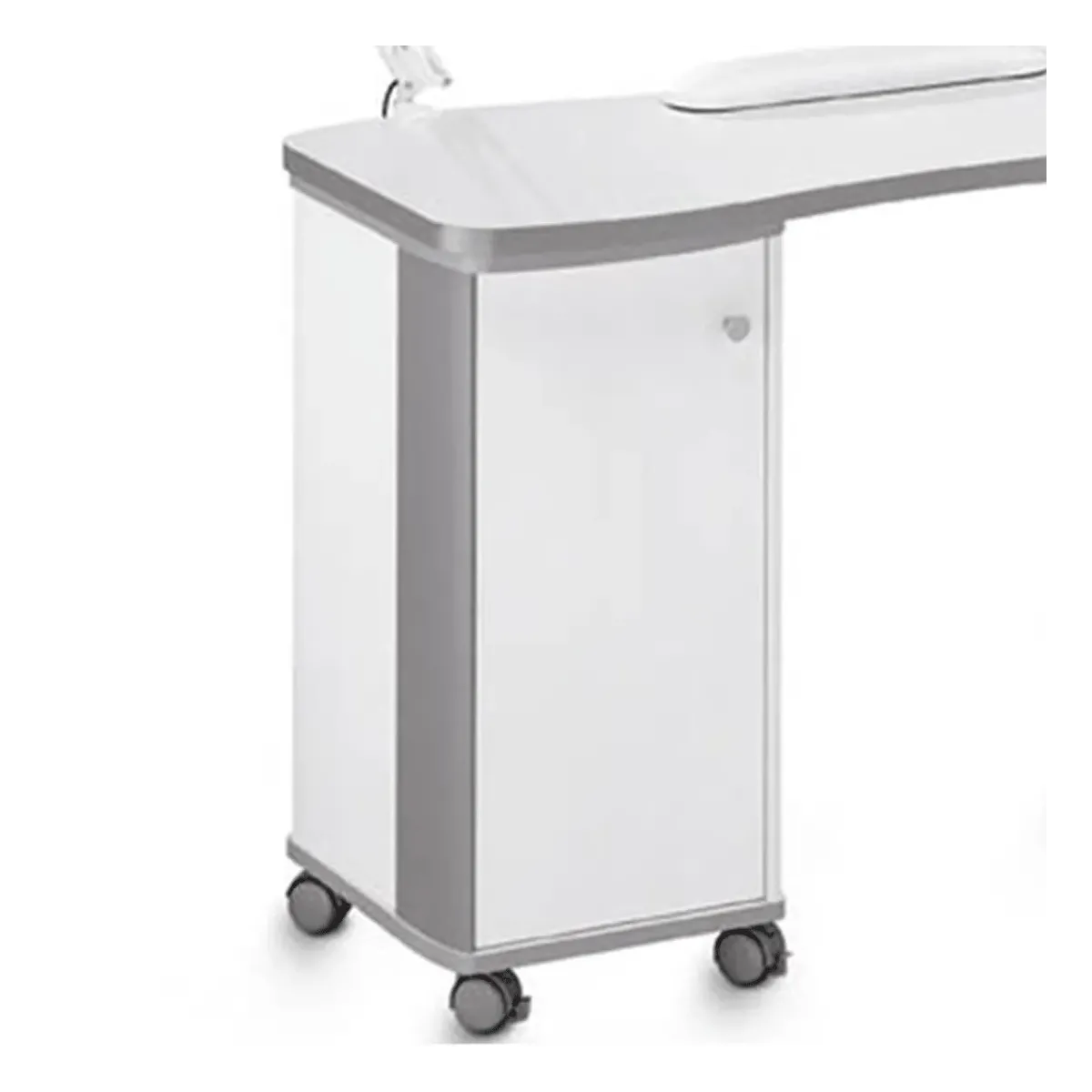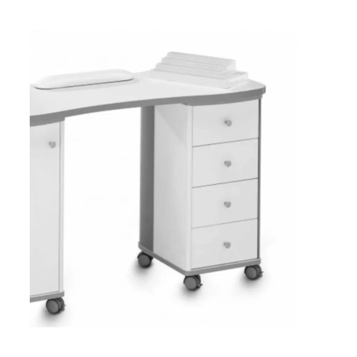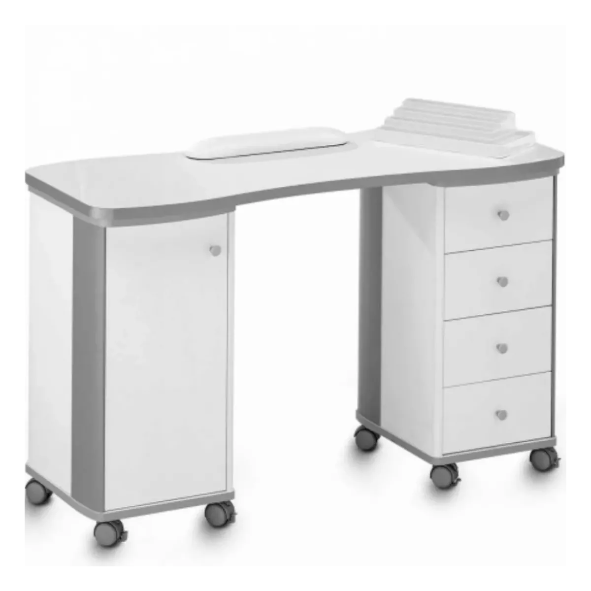 Praticissimo e solido Tavolo per Unghie con ampio piano sagomato e finemente bordato, sorretto da due mobili: uno completo di 4 cassetti mentre l'altro ha un'anta apribile frontalmente con mensola interna, ideale per posarci tutte le attrezzature più grandi come ad esempio la fresa per unghie.