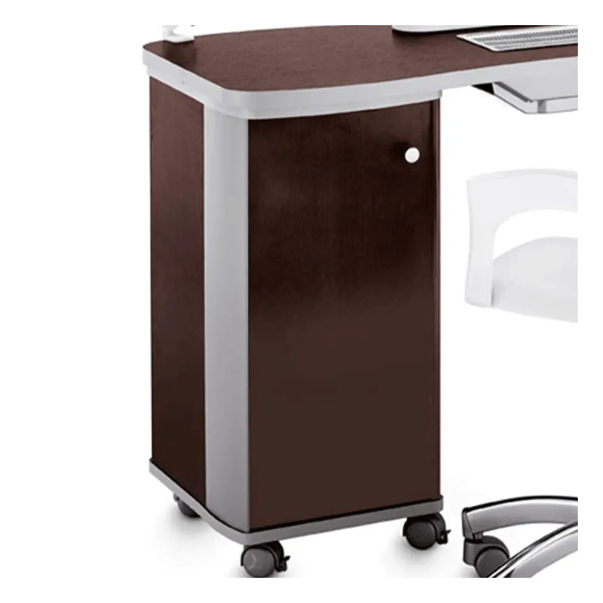 Tavolo per Ricostruzione Unghie Professionale con ampio piano sagomato e finemente bordato di colore wengé, a sorreggerlo c'è 2 utilissimi mobili strutturati diversamente: uno con 4 cassetti estraibili con manico, l'altro è un mobile con anta apribile frontalmente con mensola interna, ideale per attrezzature da lavoro più grandi come frese ed altri utensili. Entrambi i mobili hanno dellee ruote gommate auto frenanti, utili per garantire stabilità durante il lavoro e funzionalità nel caso desideri spostarlo per eventuali pulizie.