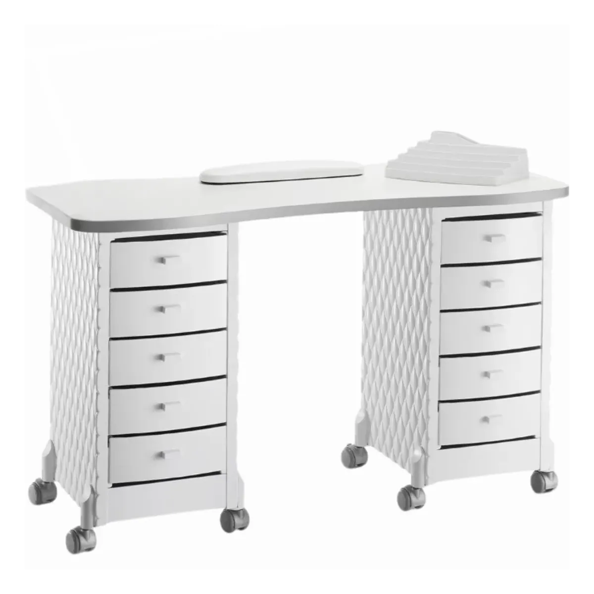 Tavolo Ricostruzione Unghie Professionale di grande effetto, formato da un piano di lavoro in legno bianco con bordi rifiniti di colore grigio, molto ampio che consente di ospitare tutte le attrezzature senza ingombrare lo spazio che servirà a te e alla tua cliente. Il piano è sorretto da 2 mobiletti con 5 cassetti estraibili ognuno dall'effetto trapuntato che dona un tocco di unicità ed eleganza ad un complemento d'arredo essenziale per il tuo centro estetico. Inoltre il tavolo e compreso di ruote girevoli con freno che permette di ottenere stabilità durante le lavorazioni e praticità quando vorrai spostarlo.