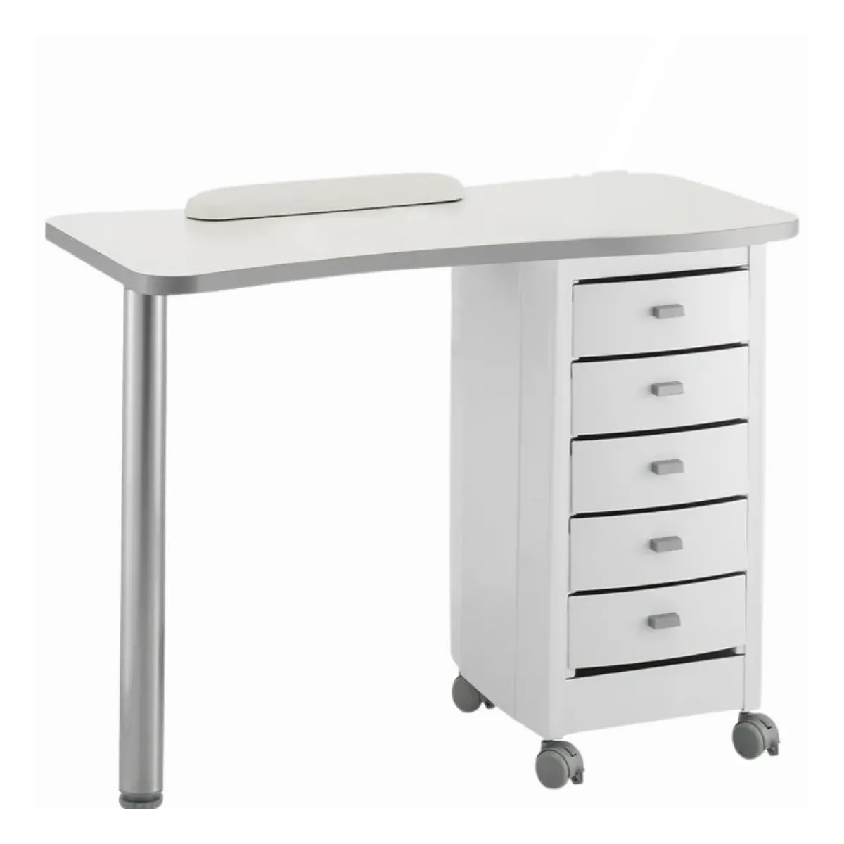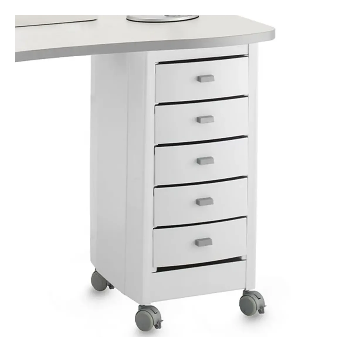 Tavolo Estetista con ampio piano di lavoro in legno con bordatura grigia fine ed elegante. La struttura è formata da un mobiletto in plastica termoformata con 5 grandi e capienti cassetti estraibili con manico, sono presenti anche delle rotelle con freno per maggiore stabilità e praticità. Al lato opposto è presente una gamba di sostegno in acciaio verniciato regolabile in altezza per non avere problemi di postura durante le sessioni di lavoro più durature.