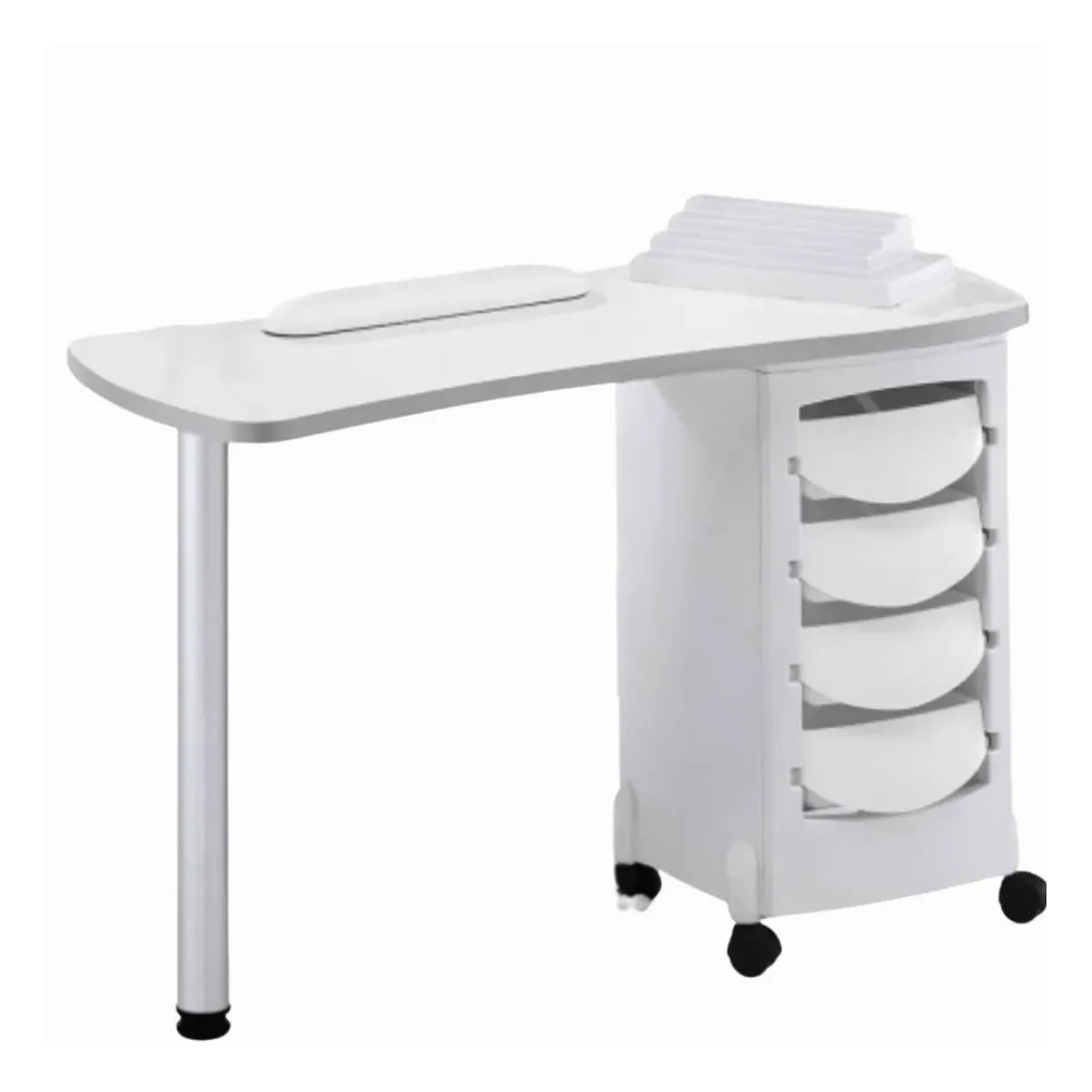 Tavolo Manicure per Estetista con ampio e solido piano di lavoro in legno di colore bianco con fini bordature grigie, a sorreggerlo sul lato destro è un mobiletto con 4 cassetti scorrevoli ed estraibili dal colore vivace per dare più vitalità al tuo negozio nail art, inoltre il mobile è dotato anche di ruote con possibilità di bloccaggio per maggiore stabilità. Sul lato sinistro è presente una gamba in acciaio verniciato regolabile in altezza per non sforzare la schiena ed ottenere una corretta postura durante il lavoro.