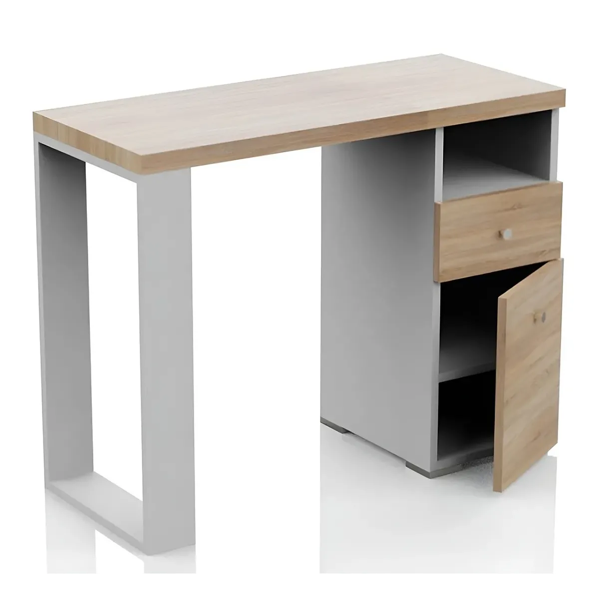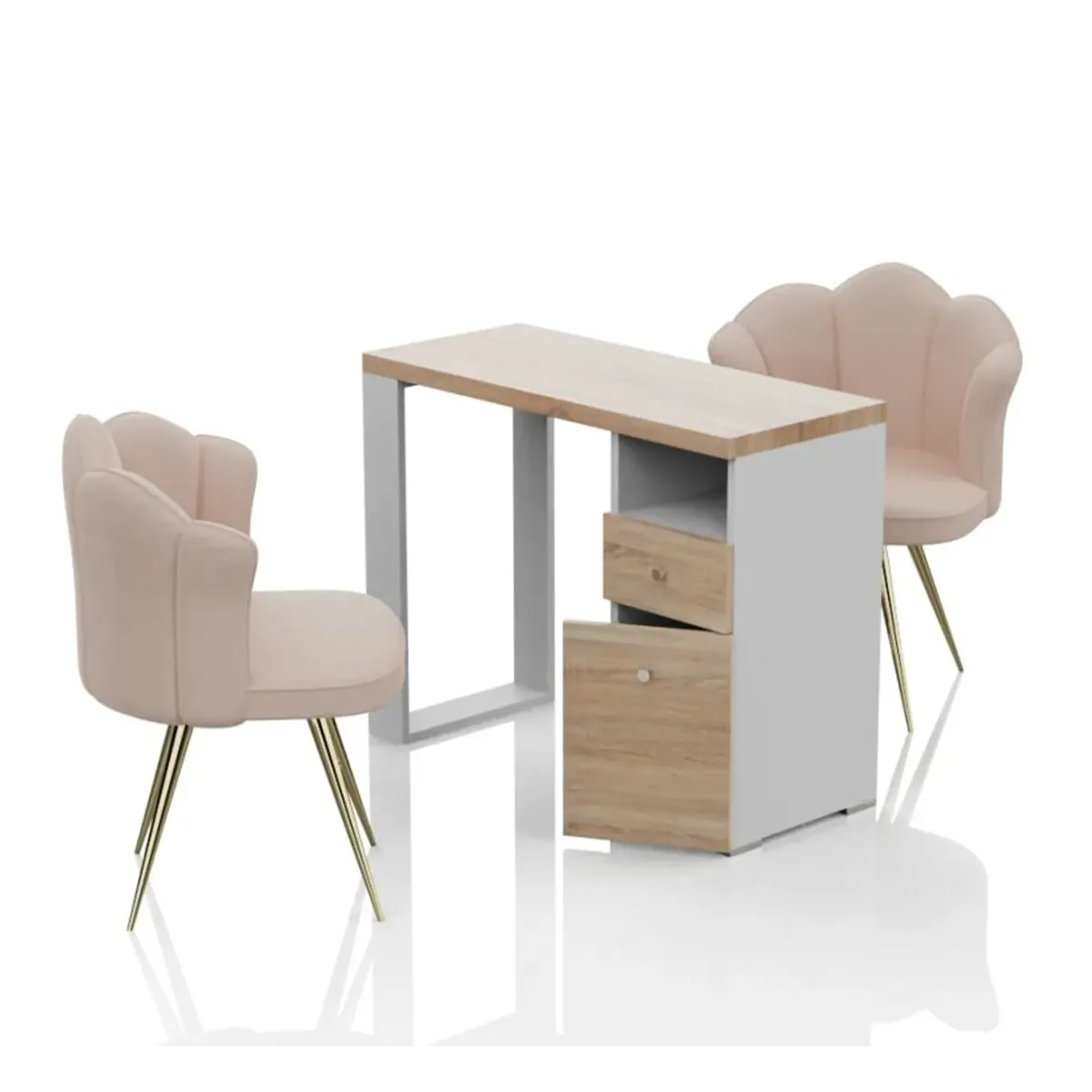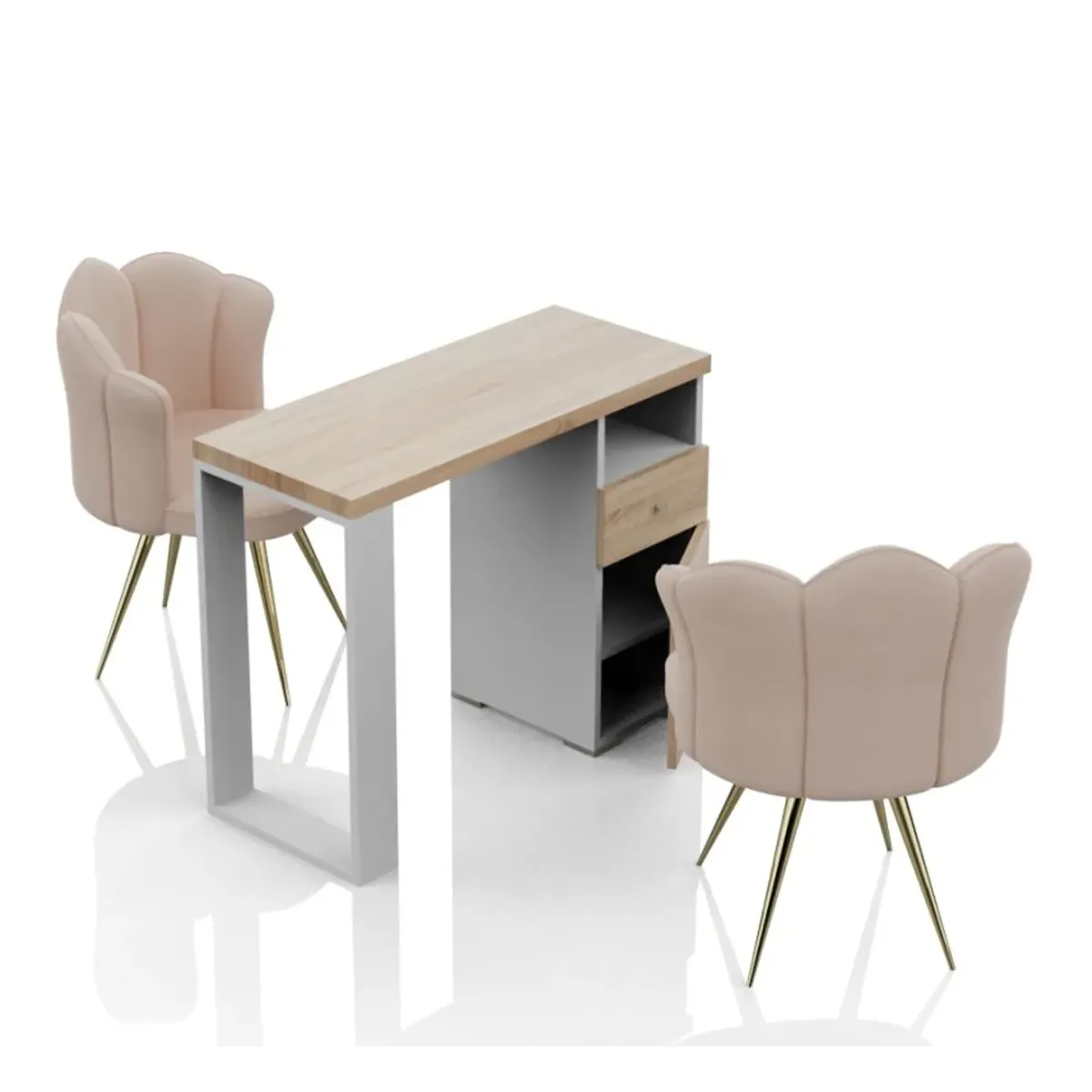 Realizzato con una combinazione di legno effetto naturale e finitura bianca opaca, il tavolo unisce estetica moderna a funzionalità. È dotato di un comodo cassetto scorrevole e un vano con anta per riporre strumenti, prodotti e accessori in modo ordinato e facilmente accessibile.
