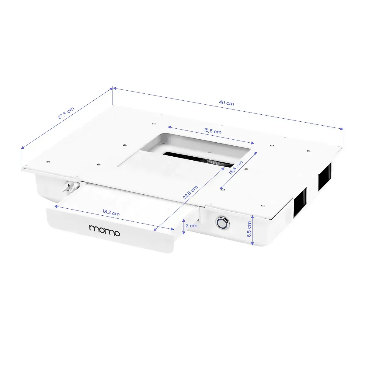Il piano di lavoro è dotato di aspiratore da 48 W integrato, utile per mantenere la postazione sempre pulita durante il trattamento, e di passacavi che consentono di organizzare al meglio gli strumenti senza ingombro.