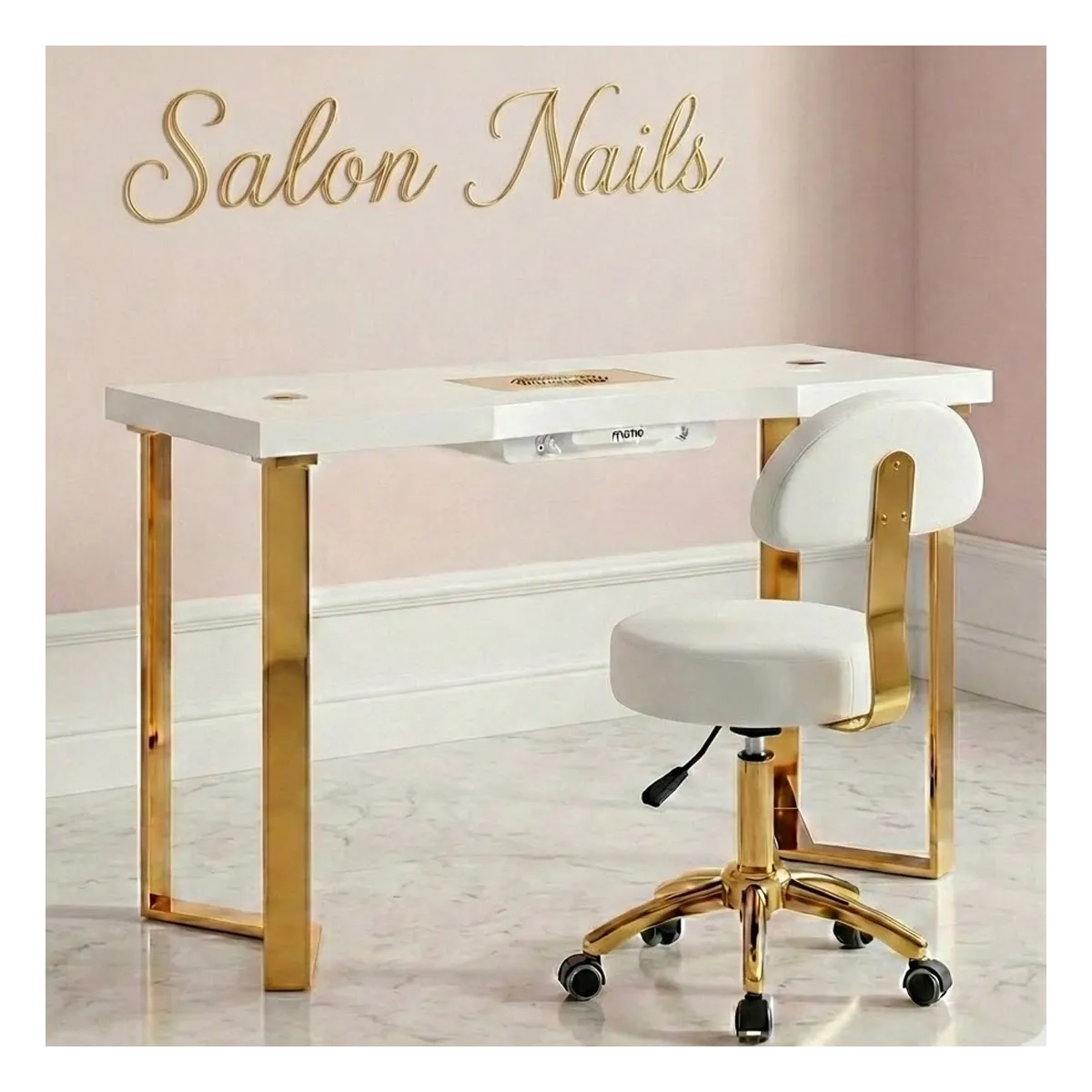 Aggiungi un tocco di lusso e professionalità al tuo centro estetico con questo raffinato tavolo manicure con sgabello coordinato. La struttura combina un piano bianco lucido con dettagli in metallo dorato, creando un design moderno e sofisticato. Il tavolo è dotato di aspiratore integrato e fori passacavi per mantenere l’area di lavoro pulita e ordinata, mentre lo sgabello regolabile con seduta e schienale imbottiti assicura il massimo comfort durante i trattamenti. Perfetto per saloni di bellezza, spa e nail bar che vogliono unire stile e praticità.