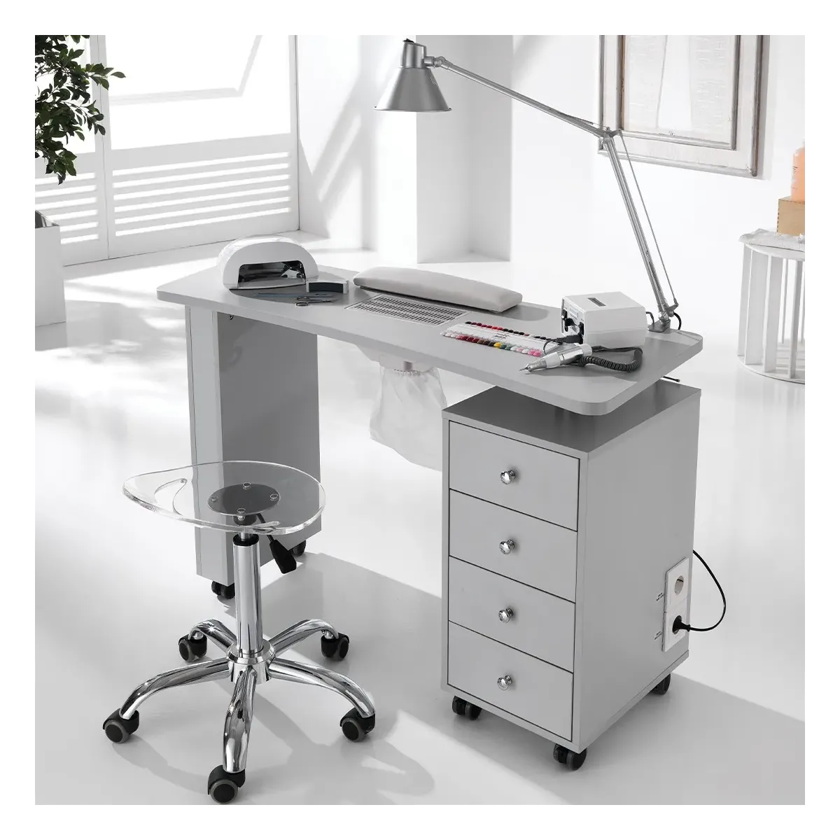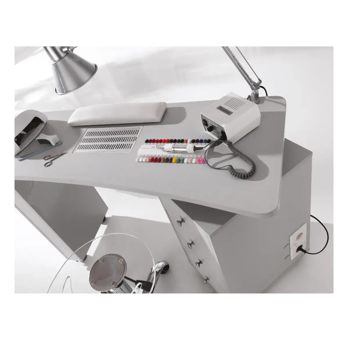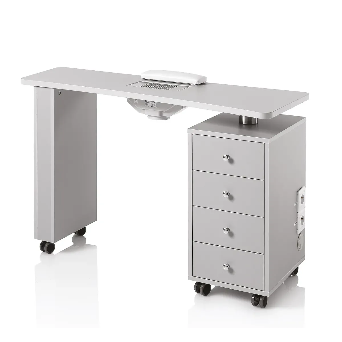 Pro 1 , è un tavolo da manicure e ricostruzione delle unghie, strutturato con una colonna composta da 4 cassetti e un piano lavoro attrezzato con aspiratore INBUILT FAN. Arreda elegantemente lo spazio di lavoro, è pratico da contenere e da spostare, è dotato di comode prese di corrente per poter utilizzare tutto ciò che serve al professionista senza dimenticare l'eleganza.