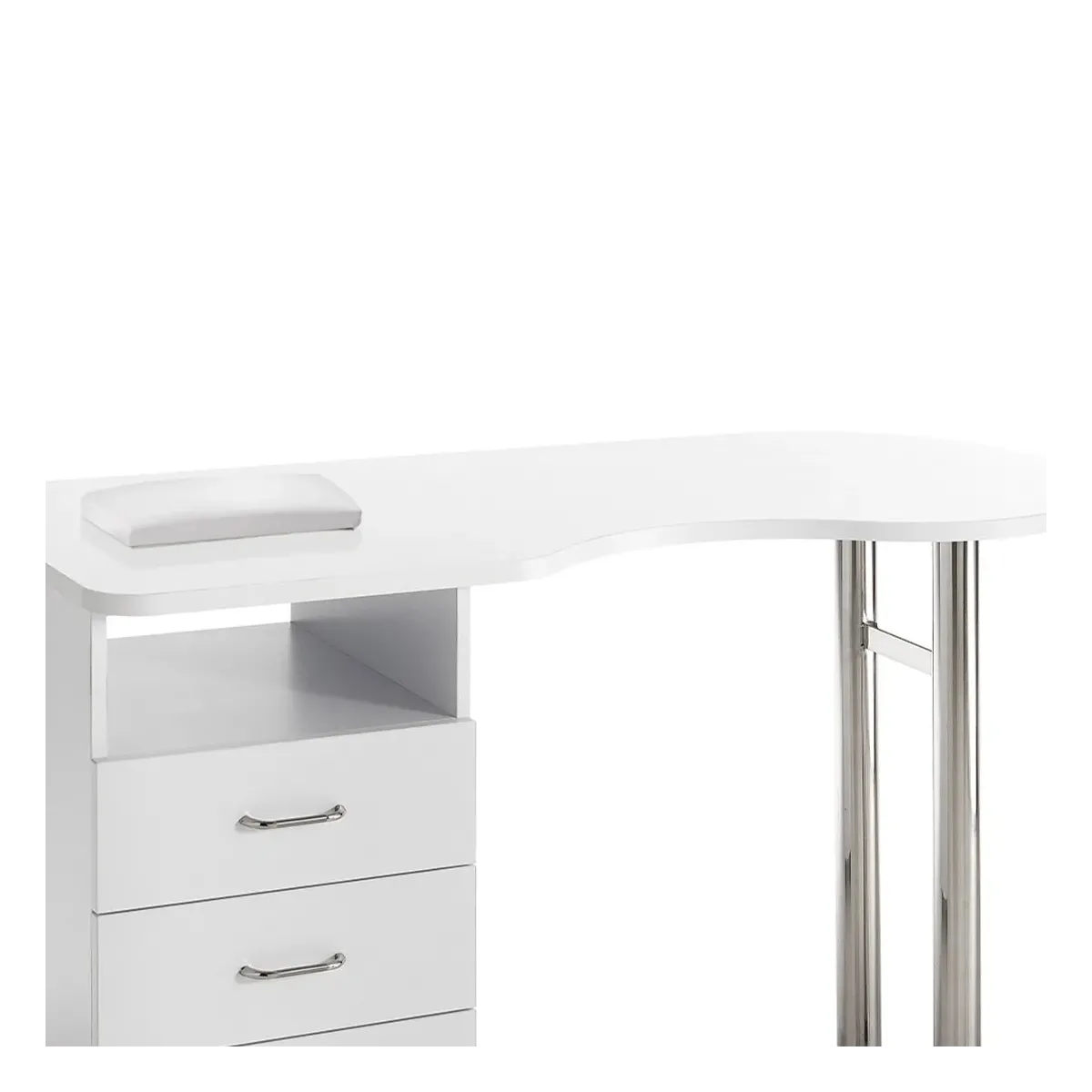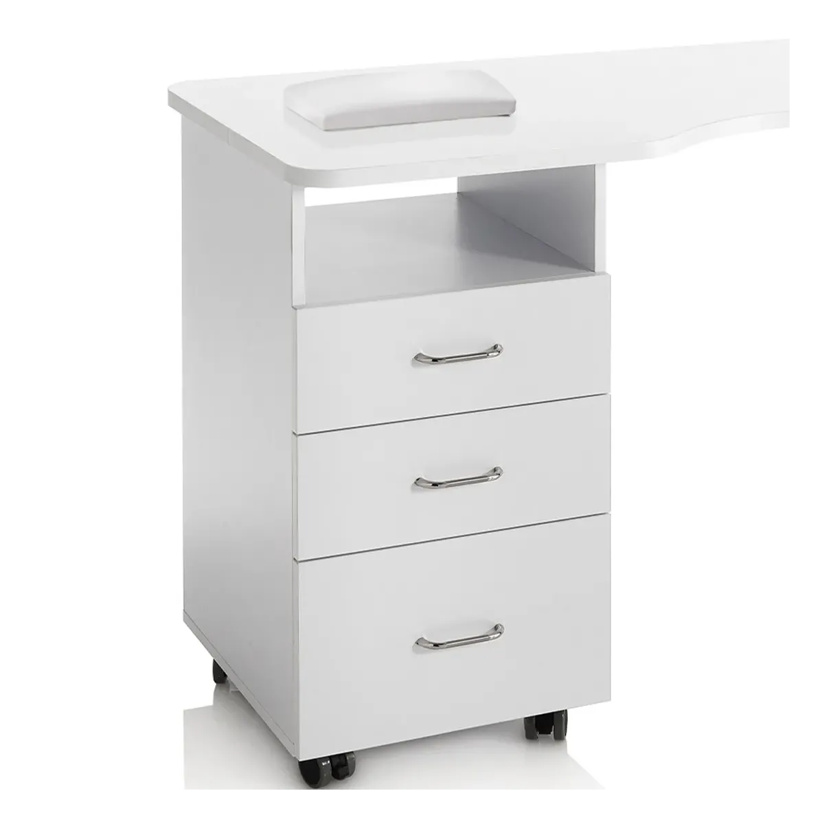 Tavolo Manicure Professionale con struttura in legno laccato di colore bianco, piano di lavoro ampio completo di cuscino poggiamani. Gamba di sostegno in acciaio che sorregge la struttura insieme ad una cassettiera che comprende un ampio vano, 2 cassetti estraibili e un cassettone, molto spazioso per poter riporre attrezzature più grandi come ad esempio le frese per unghie. Alla base la cassettiera presenta delle ruote bloccanti per rendere il tavolo più stabile e allo stesso tempo faciliteranno lo spostamento.