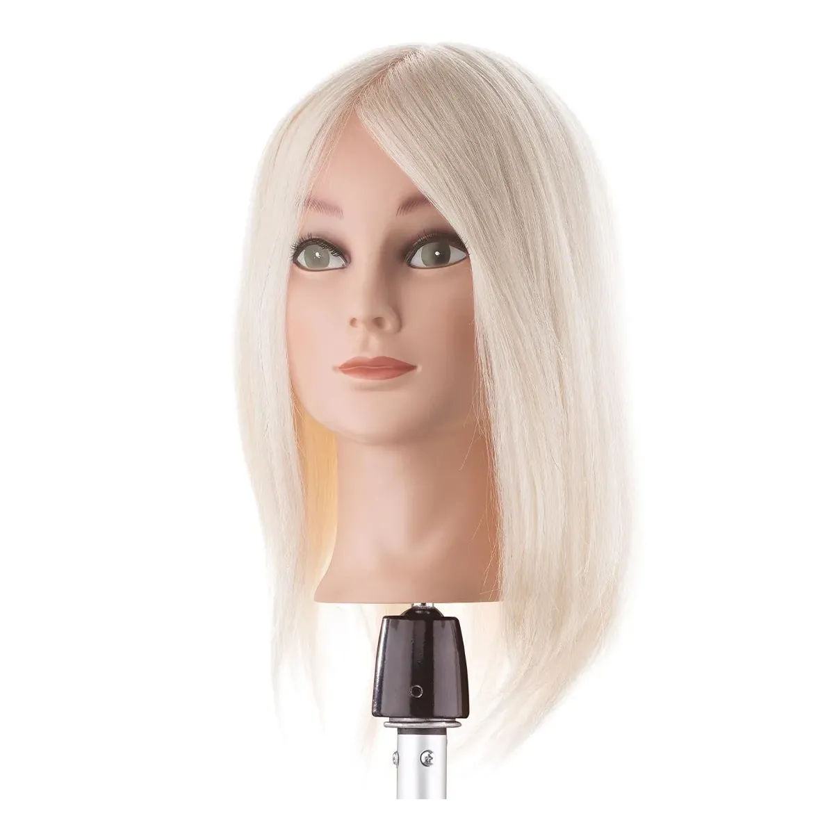 Testina da Parrucchiere per Accademia e scuola di formazione con chioma assemblata di capelli al 100% in fibra naturale di angora di colore bianco con lunghezza di circa 35 cm ad alta densità. La testina è estremamente utile per risultati perfetti per tutti i tipi di colorazioni. Ideale sia per colori chiarissimi che per colori accesi. Garantisce un risultato ottimale anche per pieghe e acconciature.