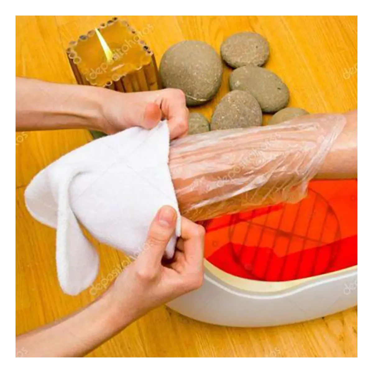 - Creatasi la pellicola, racchiudere la parte interessata e metterla all'interno dei sacchetti paraffina dopodiché utilizzare i calzari paraffina in spugna termici per completare l'impacco. Attendere circa 20 minuti per dare modo alle proprietà della paraffina di agire e di penetrare all'interno della cute.
