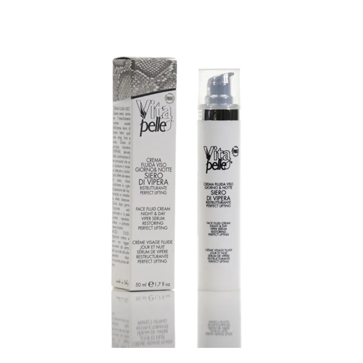 Frutto degli studi più innovativi, dai nostri laboratori nasce la nuova linea Vitapelle al siero di vipera. Il principio attivo utilizzato è un tripeptide sintetico che viene sfruttato alla sua massima potenza, perfettamente compatibile e formulato in una concentrazione adatta al nostro organismo. Risulta una fedele riproduzione della proteina naturalmente contenuta nel veleno della vipera. Il veleno paralizza, mentre questo straordinario principio attivo riduce le contrazioni muscolari e inibisce e previene la comparsa dei segni del tempo; il risultato è un effetto distensivo delle rughe mimiche senza però interferire con le naturali espressioni del viso.