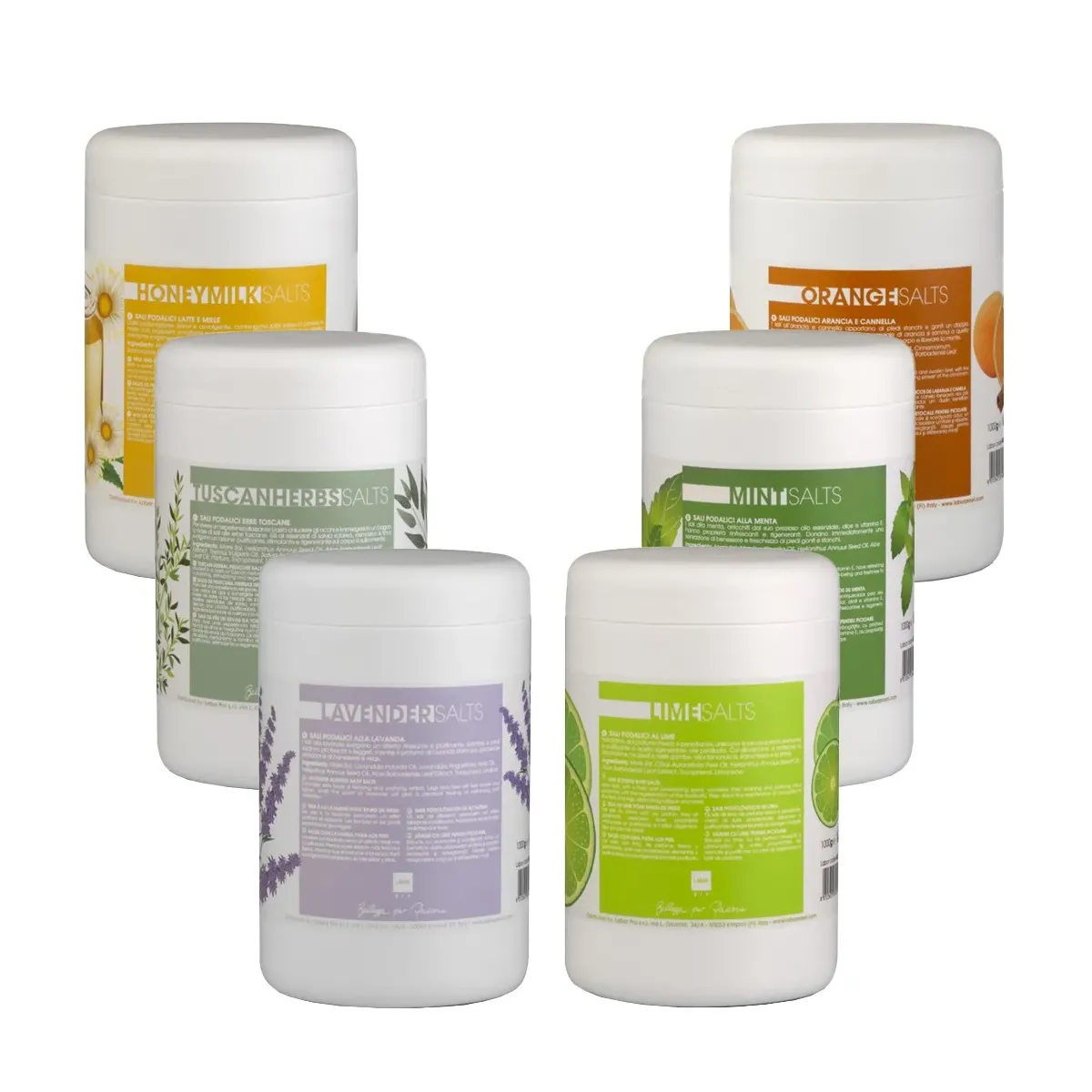 I sali podalici da bagno vengono utilizzati dalle estetiste nei migliori centri estetici e centri benessere per inserirli nella vasca pedicure in plastica o anche nella vasca pedicure idromassaggio e ottenere così risultati altamente professionali ma allo stesso tempo far rilassare la cliente o trasmettergli benefici ai piedi e alle gambe. Vediamo le varie fragranze in formato da 1 kg: