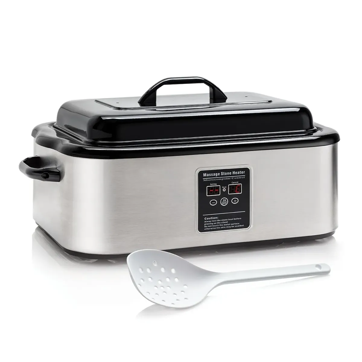 Fornello per il riscaldamento di pietre per massaggi. Regolazione temperatura digitale e mantenimento costante del calore. Rapidità di riscaldamento. Dotato di ciotola interna estraibile per facile pulizia e di alta capacità 12 Lt. . Esterno in acciaio inox, vasca interna asportabile per una comoda e facile pulizia, 2 comode maniglie per il trasporto e gli spostamenti, coeprchio per mantenere al meglio la temperatura e ridurre i consumi, semplicità di utilizzo