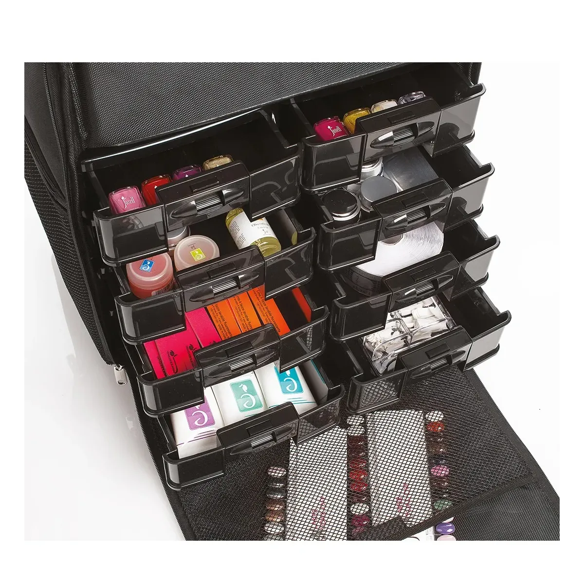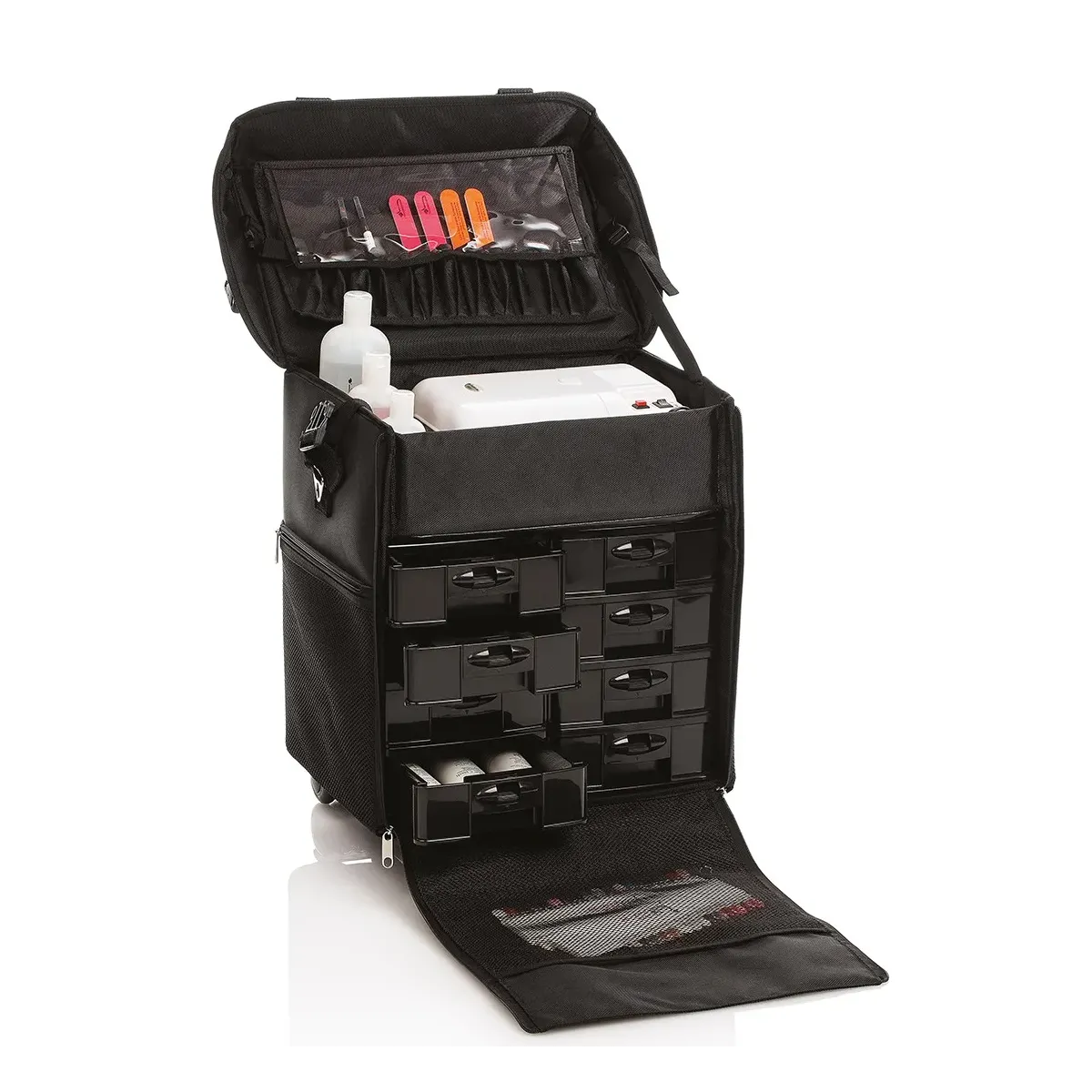 Trolley Estetista Professionale è uno strumento indispensabile per lo svolgimento del lavoro a domicilio per l’estetista ma anche per le studentesse che voglio iscriversi ad un’accademia scuola per estetista. E' abbastanza voluminoso per poter contenere tutte le attrezzatura per lo uno svolgimento corretto dei vari lavori da eseguire: ricostruzione unghie, onicotecnica, nail artist truccatrice e visagista. Il trolley professionale per estetista ha diversi scomparti per i vari attrezzi da lavoro, e abbastanza voluminoso ma allo stesso tempo è molto leggero perché è dotato di rotelle per facilitare il trasporto, infine ha un rivestimento impermeabile che facilita la pulizia.