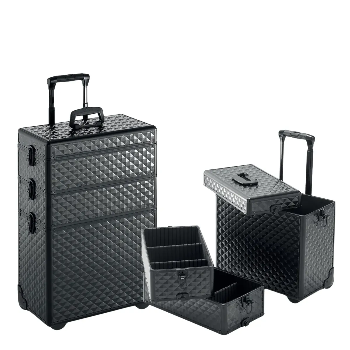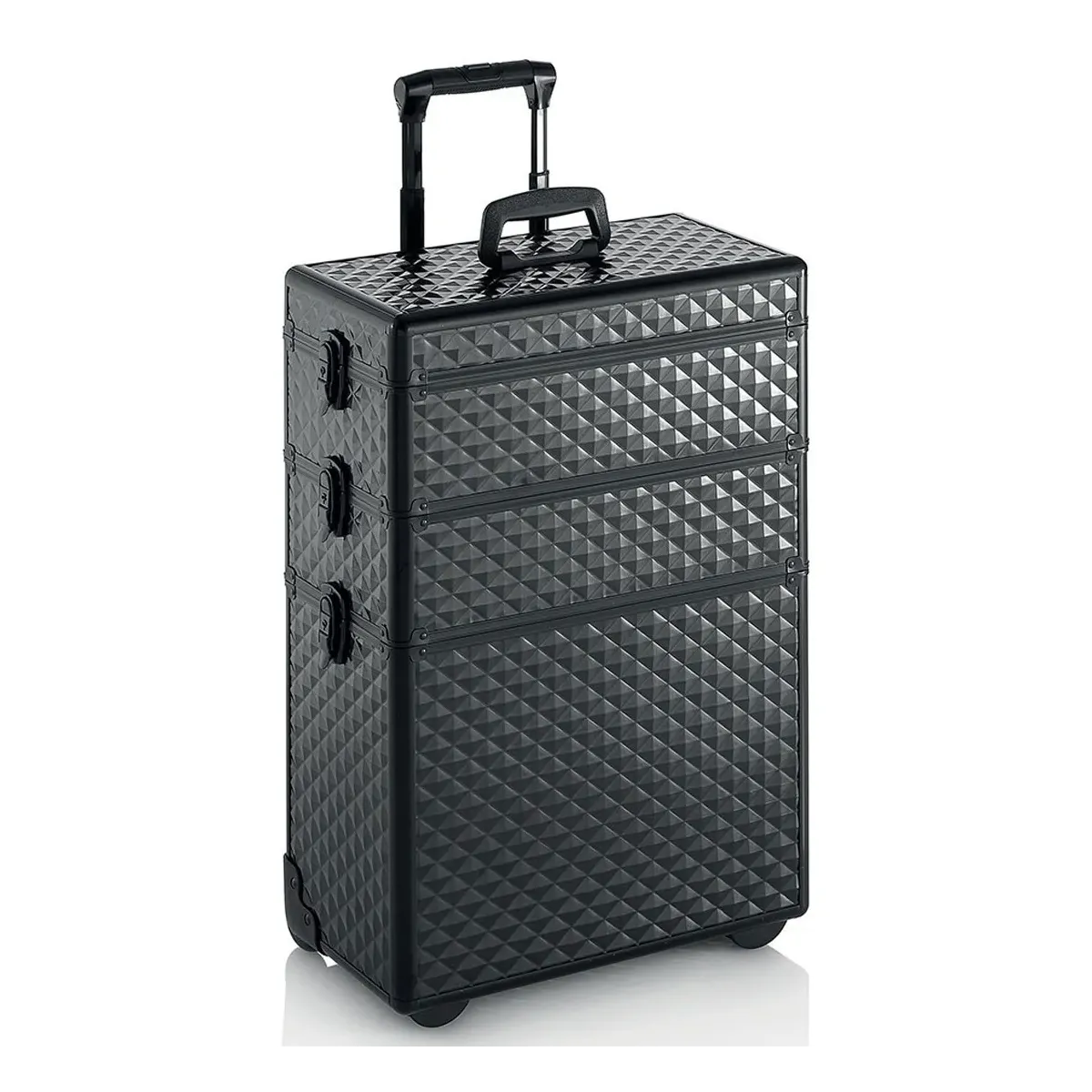 Trolley Professionale Estetista e Parrucchiere rigido con effetto diamantato per proteggere e portare a spasso i tuoi strumenti con stile. Grazie ai 3 scomparti è capace di portare di tutto ed è ottimo sia per le estetiste che per i parrucchieri. Quattro ruote in gomma roller silence, silenziose e con sistema anticapelli, sono rimovibili e multidirezionali rendendo semplicissimo lo spostamento anche grazie all'asta telescopica.